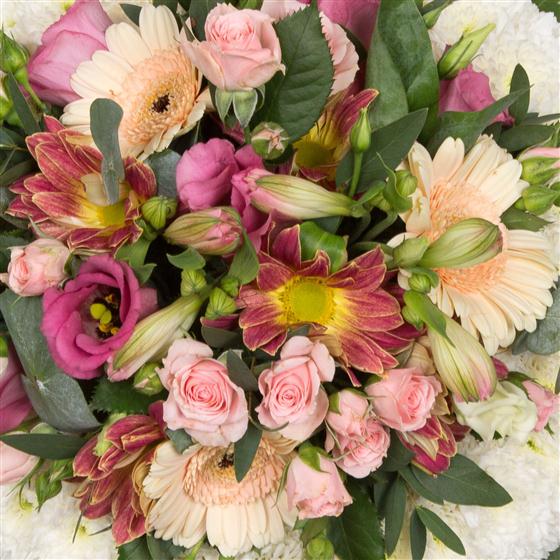 A compact posy arrangement with a white chrysanthemum base and a spray of mixed flowers available as pictured or in your choice of colours.