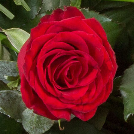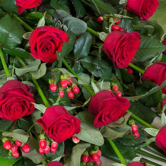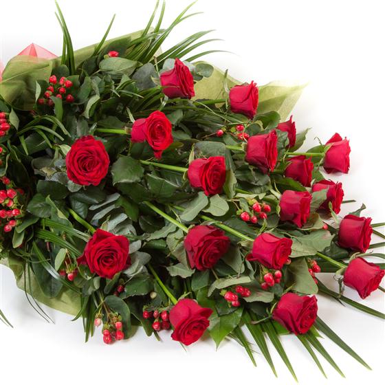 Long stemmed red roses, hypericum berries and mixed foliage combine to make an elegant, simple tribute. Roses are available as pictured or in white, pink or yellow.