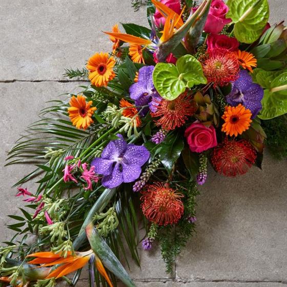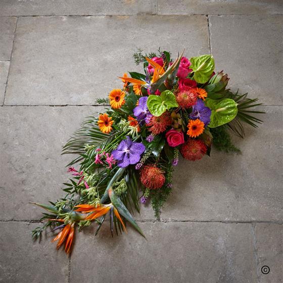 Tropical flowers and vibrant colours give this luxurious spray a glimpse of paradise. Exotic anthuriums, birds of paradise, and gerbera are reminders of sunny days, making this an individual tribute and a celebration of life.