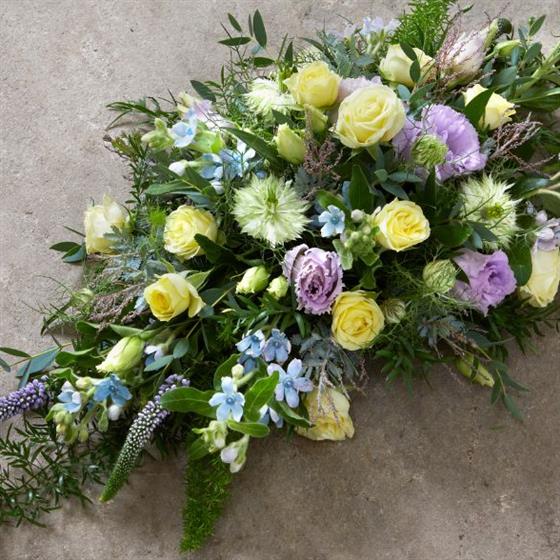 This is a small and delicate baby spray for a tiny coffin. The miniature spray, created in dreamy pastel shades, will help to soften the sadness of a day of immense and heartfelt loss.