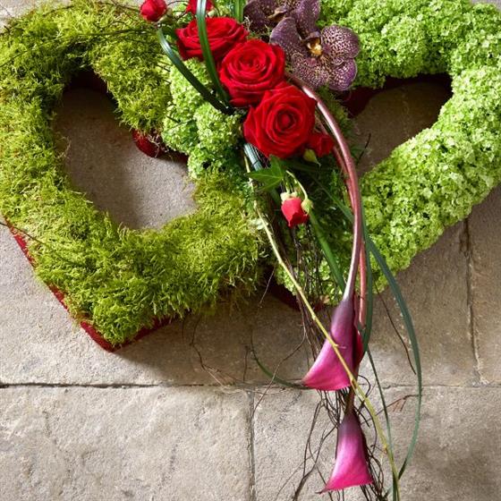 Entwined hearts portray enduring love, making a powerful declaration of adoration. From a base of mossy green, crimson roses, exotic orchids and callas unite the twinned hearts, providing comfort on a heartbreaking day.