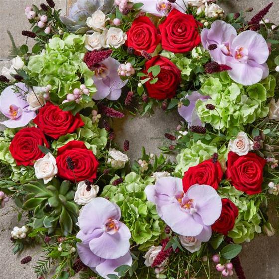 The loose wreath has a natural, effortless style, enhanced by exotic orchids and striking red roses. This creates a glamorous and dramatic effect, adding a high-fashion flair to the traditional wreath.
