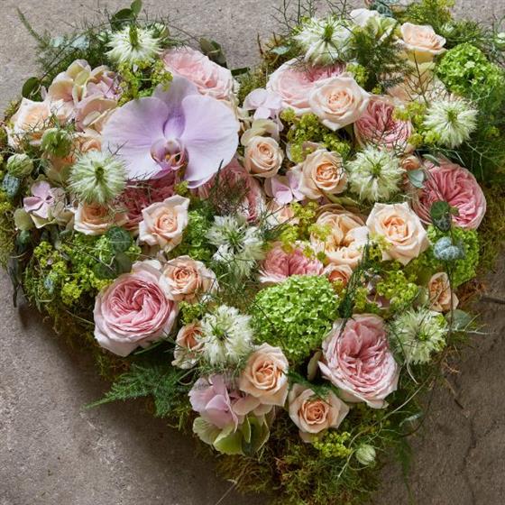 This heavenly heart beautifully represents the enduring symbol of love. It features a collection of fragrant roses on a mossy base. The calm styling of the heart can be created in various sizes to evoke happy, heartfelt memories.