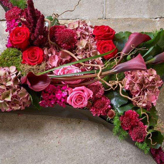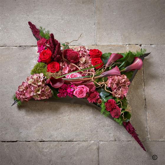 Symbolic of a final resting place, this classic pillow tribute has been updated with clusters of joyful colours, creating a bed for elegant calla lilies to rest. It is a celebration of a life filled with love.