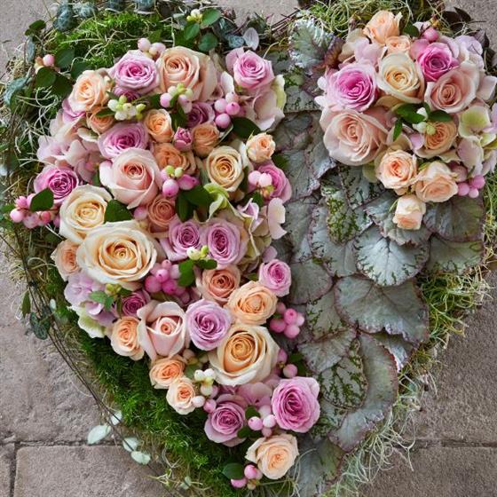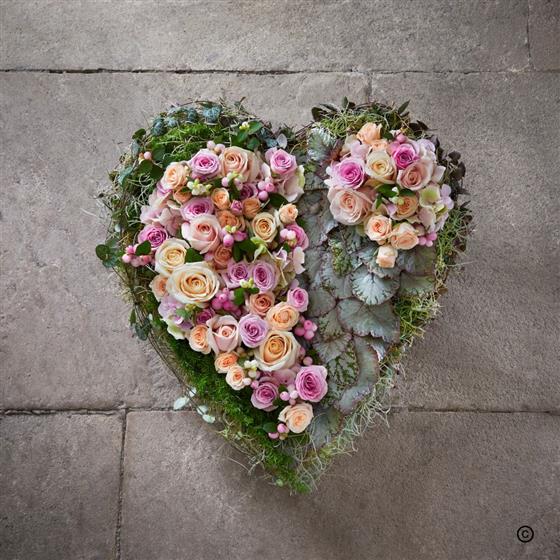 When words are not enough, this delicately coloured heart is an emotive tribute to express feelings of love. Dreamy cream and peach roses are set against a textural foliage base, a modern rendition of a classic love heart.