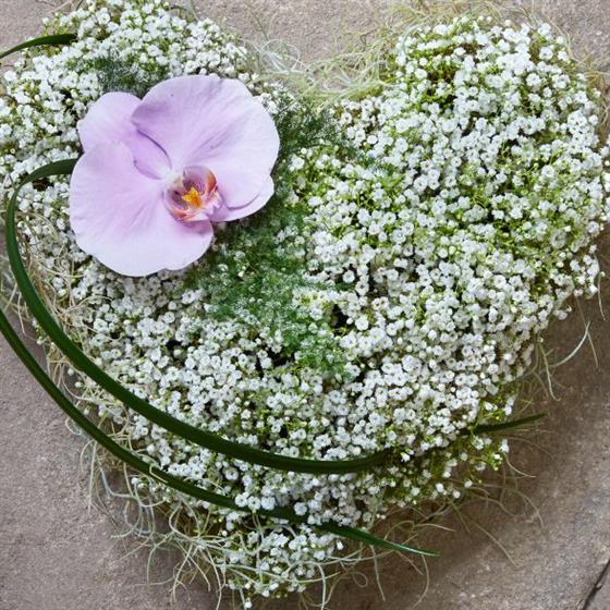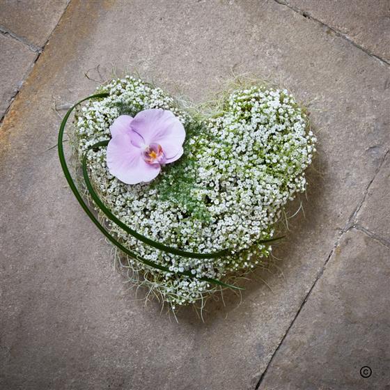 Small white floral heart with a single pale orchid and grass loop, suitable for a child’s tribute or understated memorial piece.