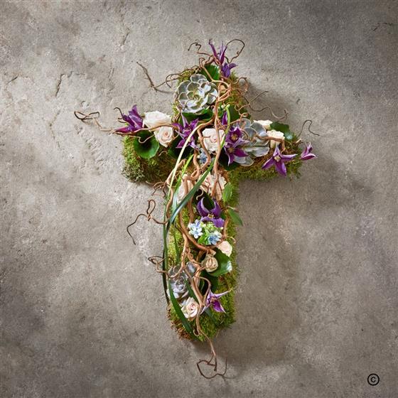 This small cross is ideal for a woodland burial. It is made on a natural moss base to blend harmoniously with its surroundings. The beautiful flowers will naturally decompose, returning to the earth.