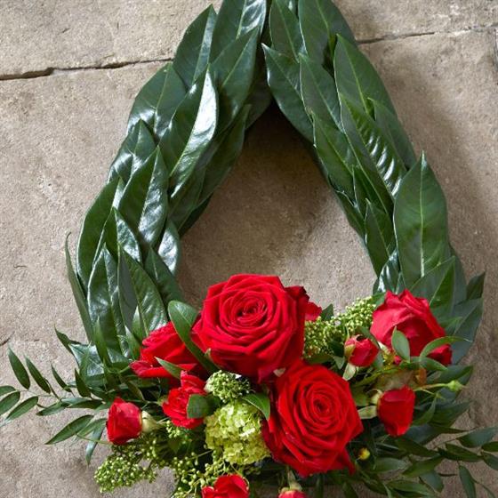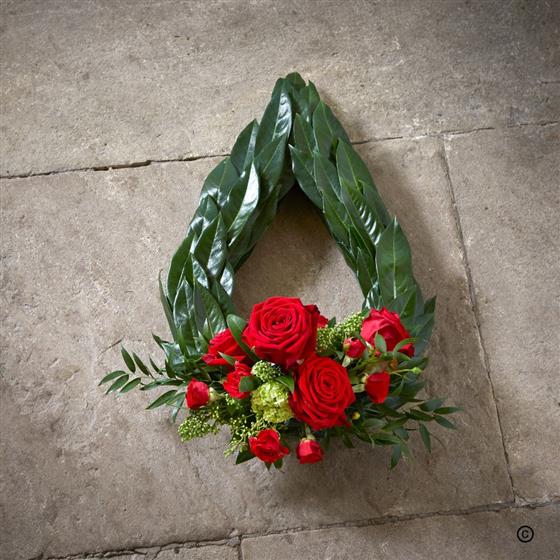 Teardrop chaplet design with grouped peach roses, orchids, green anthurium, soft lilac flowers, grass loops and foliage. Suitable as a floral tribute for the coffin or graveside.