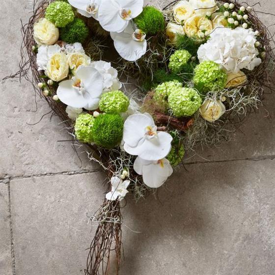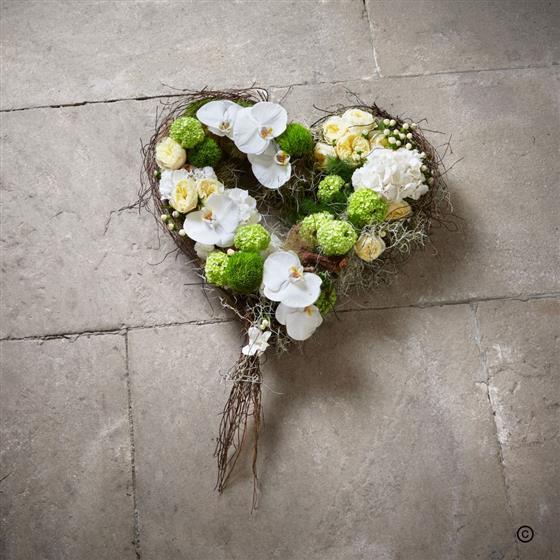 A natural heart made on a recyclable base is a sustainable option for minimalising the impact caused to the earth. The twig-framed base holds a magical selection of distinctive flowers to reflect fond memories shared.