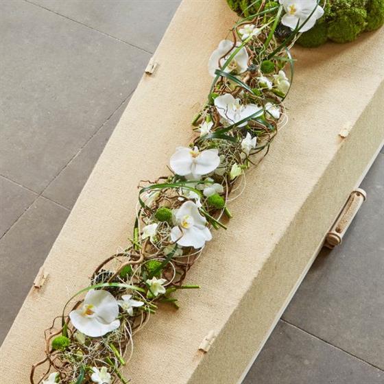 This unique and stylish coffin tribute features a lavish garland of orchids on a twig pathway. The garland trails from a natural moss wreath, gently tipping over the coffin's side, creating an elegant and distinctive natural tribute