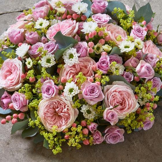 The abundant look of a country garden ensures this posy will be a popular natural tribute. Pretty pink cottage garden roses mingle with lime green tones and peachy berries for a fitting tribute for a best friend or loved one