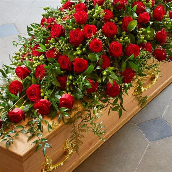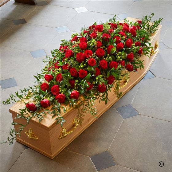 The ultimate last gift of love is the classic full-length coffin spray of deep red roses. Dark green foliage enhances the red roses in this evocative message of love from all the family.