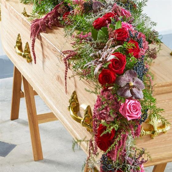 For the love of your life, a lavish garland of romantic crimson and pink roses is set against a backdrop of burgundy tones and enhanced with exotic orchids. This dreamy garland meanders across the coffin before cascading.