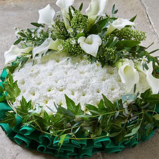 The tranquil colours of green and white give a circular tribute a simple elegance. A natural ivy edging with a calla lily spray nestling on the crisp white base conveys a calm message of love.