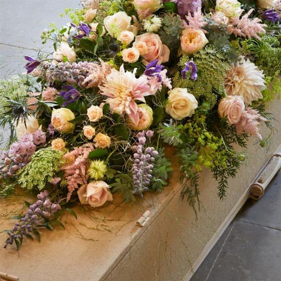 This large coffin tribute features a soft and graceful style, serving as an important family acknowledgement of a loved one’s passing.
