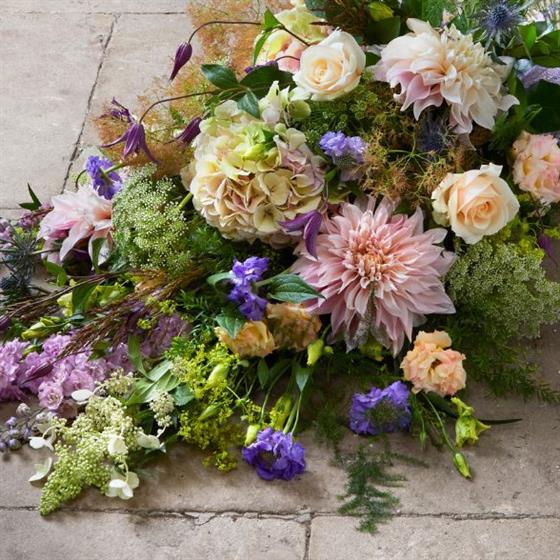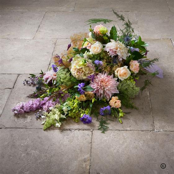 Funeral sprays are one of the most popular tributes. They can be created in various sizes and colour schemes using seasonal flowers arranged to reflect the time of year. This particular design showcases a selection of mid-summer flowers.