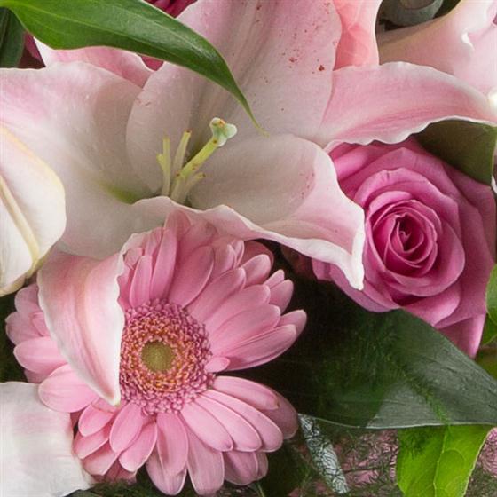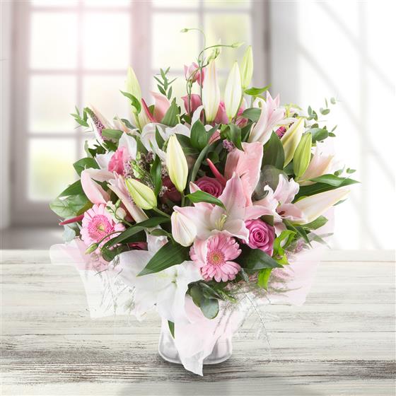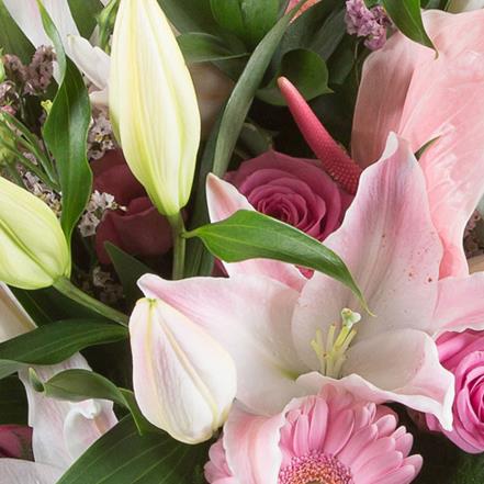 A sophisticated array of fragrant pink lilies, lime foliage, anthuriums and roses make this a stylish choice.