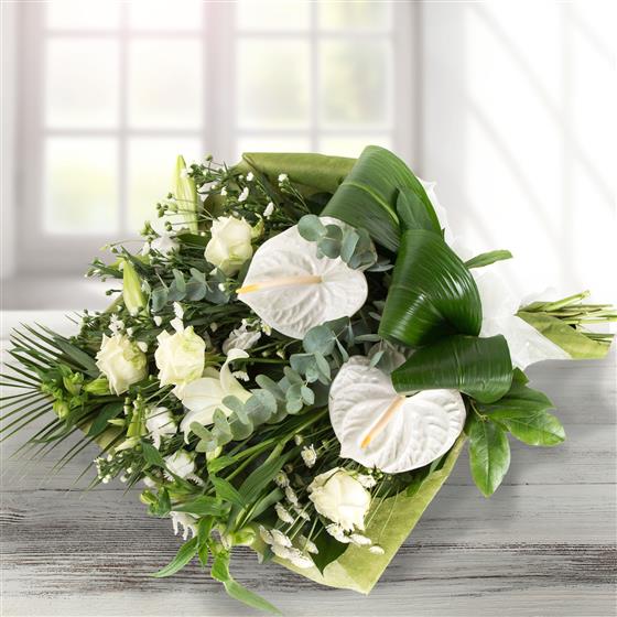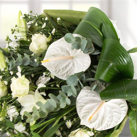 A simple combination of cream and white blooms and unusual greens. Anthuriums, lilies and roses are included in this stylish bouquet.